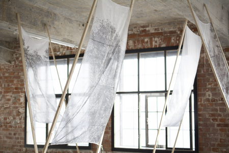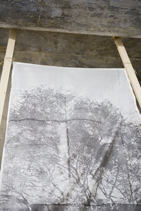 "Dreaming the woods II" is an installation of wood and silk. The work constructs a route that develops looking upwards alluding to the posture of the body when it faces the sky framed by the trees.