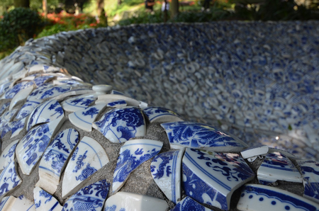 Fragments of china porcelain form this funnel into Yu Lei mountain, an artpiece along the historic tea trade trail. At first sight it can be read as a tribute to the ancient culture, that is still feeding our culture today. Patterns of blue and white porcelain in the sculpture tell us about yin and yang balance, values that are still able to inspire us beyond the challenges of modern life. At closer look you will find also pieces of porcelain coming from European countries. As happens in this sculpture, our cultures get closer and eventually we are influenced and inspired by one another. At the bottom of the funnel there is the drain, to let the rainwater out of the sculpture. The drain pipe also tells us to cherish our fundaments, and not let them be washed away.