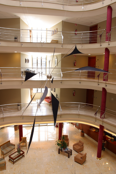 Velero Griego (Greek Sailboat) is a sculpture suspended (hanging) in the hall of the Daniya Hotel, near the sea. Transparency has been sought not to cover the spatial sensations of the different floors (levels). The arms of the sculpture extend radially like ship sails from a single core, creating a sensation of tension and weightlessness.