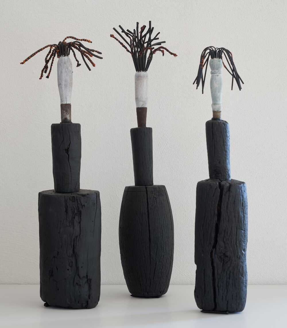 3 Stelen aus alten Bildhauerklöppeln u.a. Materialien