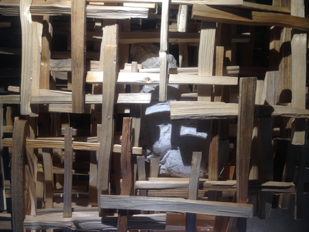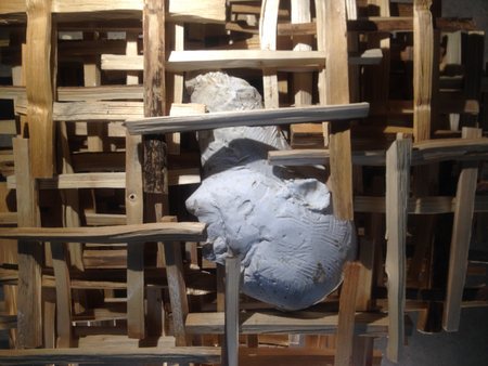 Eingebauter Portraitkopf aus Gips , in gespaltenes und gestapeltes Fichtenholz,