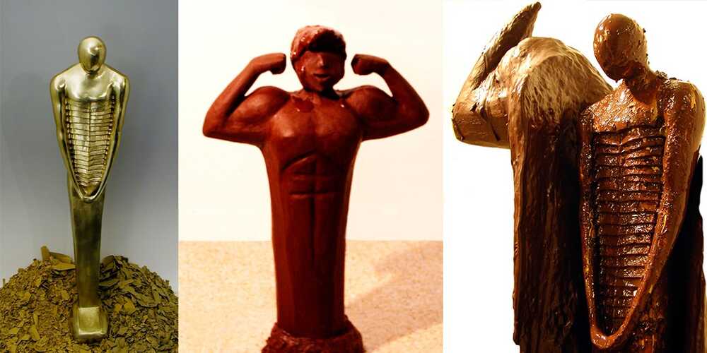 A bronze statue is standing on the floor. 85 kilograms of chocolate are applied to the sculpture and formed into the shape of a bodybuilder. When the chocolate sculpture is finished, the chocolate is melted away, revealing the bronze statue. The chocolate, therefore, serves as a human shell that disconnects from its inner self through time and eventually falls away.