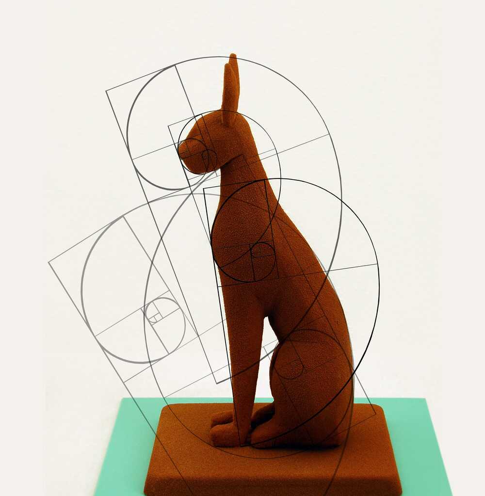 Hand-carved chocolate sculpture, then sprayed with chocolate to get a velvety texture on the surface. A print-out of a photo was used to test the relation between harmonious appearance and Fibonacci sequences numbers.