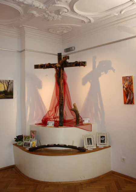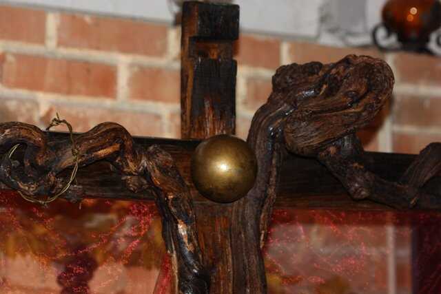 Das Winzerkreuz stellt eine Komposition aus Fassdauben und zwei ineinander verschlungenen Weinstöcken mit dem Kopf, einer mit Acryllack bemalten Niro Kugel als Kopf des gekreuzigten Heilands dar.