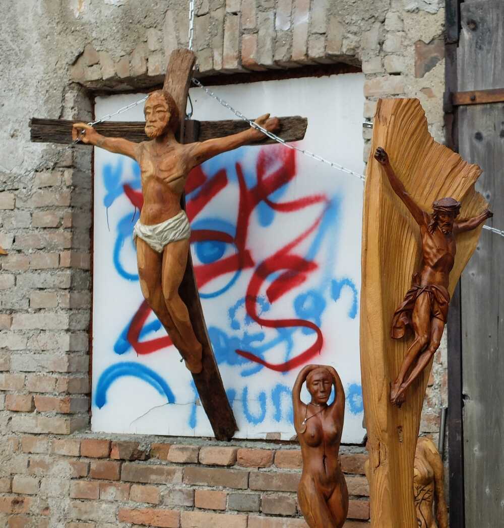 Dieses Werk (hier zu sehen bei der Ausstellung am Korneuburger Höfefest 2018 - mit zufÀllig vorhandenem Hintergrund) entstand aus zwei Fassdauben (Kreuz) und einem Marillenbaum aus Stockerau