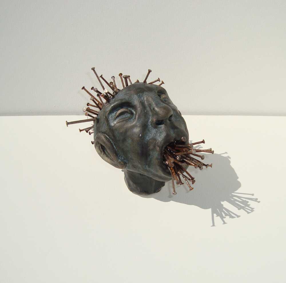 Skulptur von Trau Ma in Keramik mit Metallnägel, leicht angerostet.