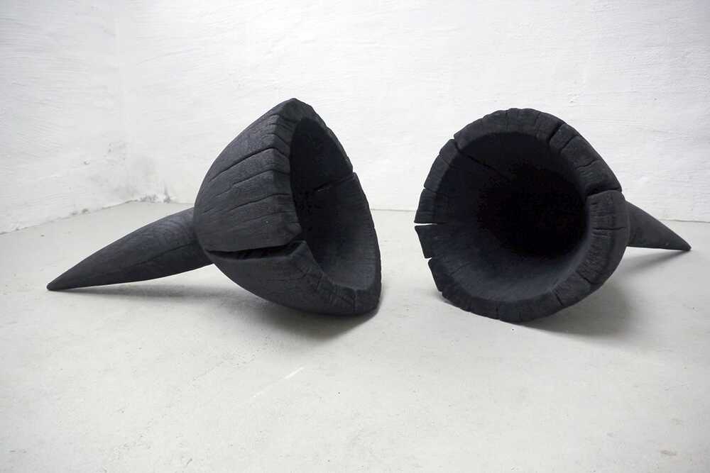 2 Skulpturen aus Eichenholz, geflammt