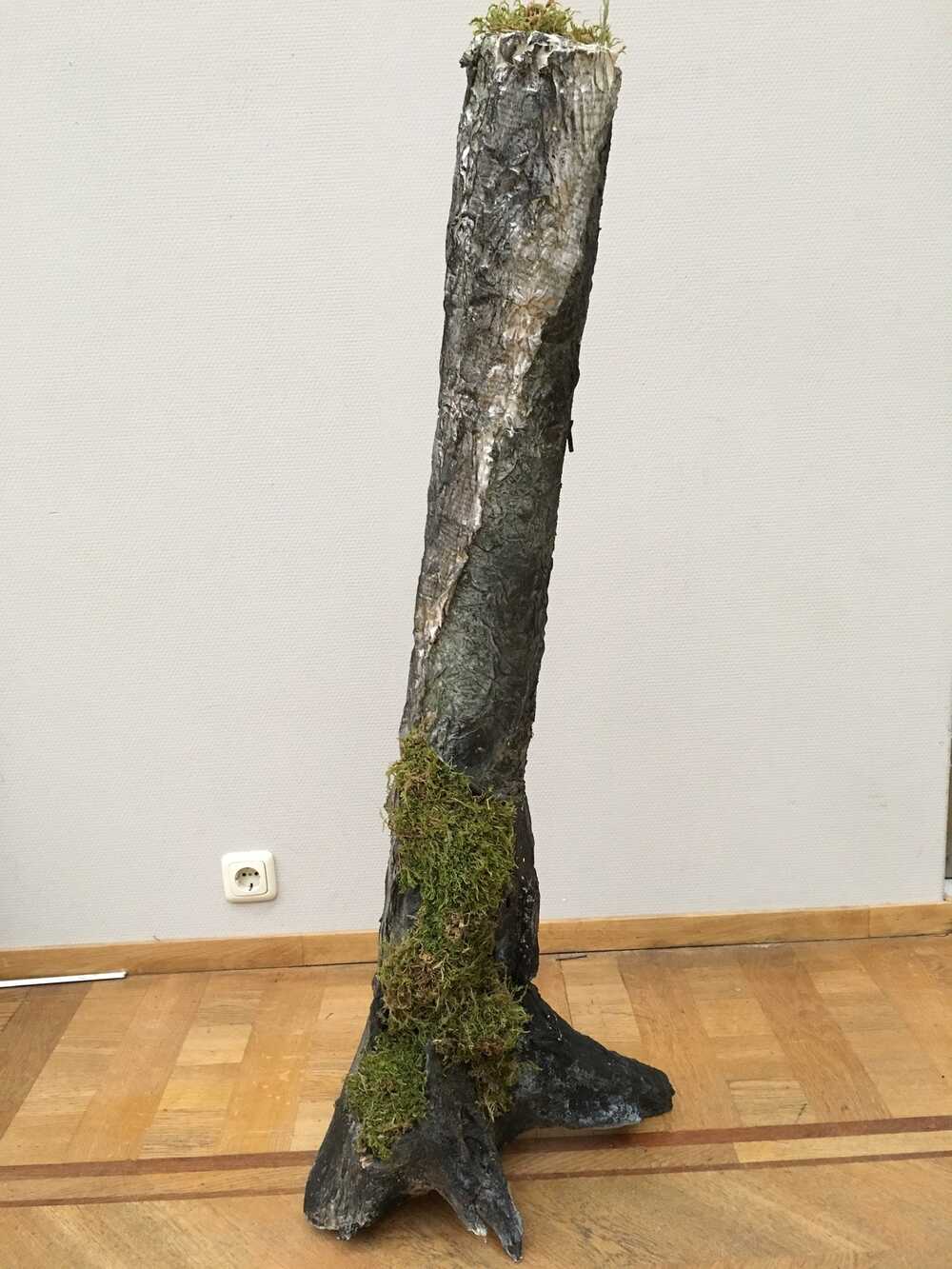 Tree trunk created from recycled paper from obsolete books and plant seeds