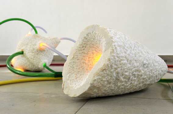 Interaktive Installation mit weiße Marmor, LED-Lampen, Bewegungssensoren, Plastikschläuchen, Arduino-Steuerung