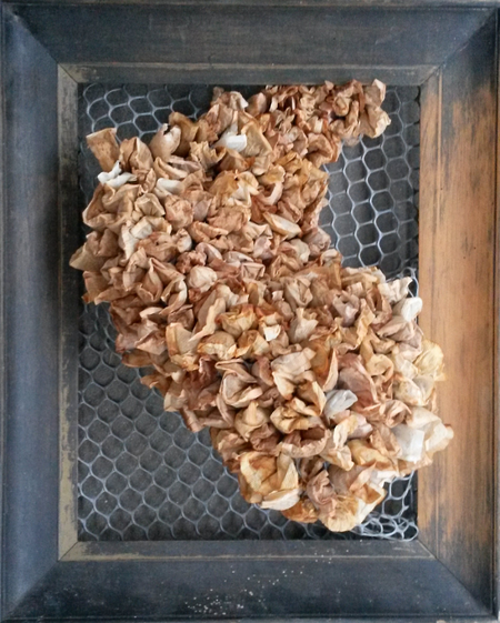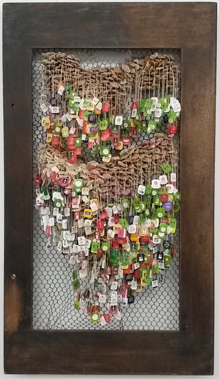 Used teabags have been part of my work since 2010. Used and reused am I intrigued by the fragility and cushion like appearance. Since I reuse and even misuse those, I play with the meaning of those words: used, reused, misused, abused. Therefore I combine teabags with other materials whenever I feel something is used in an unhealthy way.