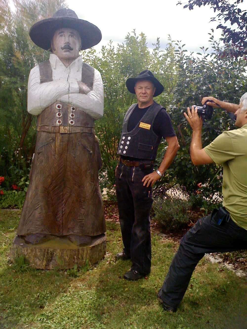 Die sechs Knöpfe an der Zimmermannswestesind die Fluglöcher der Bienen. Ein Zimmermann mit Bienen im Bauch? Unsere Vorfahren haben Husaren, Soldaten geschnitzt und mit Bienen im Inneren besetzt. Heute machen friedlichere Gesellen die Bienen gesellschaftsfähig; oder umgekehrt.