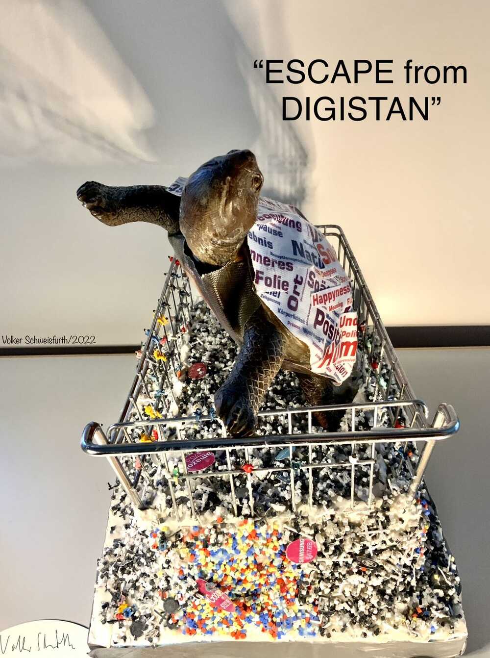 A shopping cart sinks into bits, program errors and also "wetware", the latter in the four DNA colors. Coronavirus images have settled on the bits and company logos. In the carriage a turtle, which carries on the back words from old times and connections, which might remain incomprehensible to the digital world, like Love, solidarity, happiness. On the reptile's belly, a Renaissance church painting. Zygmunt Bauman's diagnosis of "fleeting modernity" is confirmed here as well: Everything that is fixed and shaped is immediately vaporized, made liquid, turned into small pellets. Story has been told by Erich Fromm ( Sein und Haben)