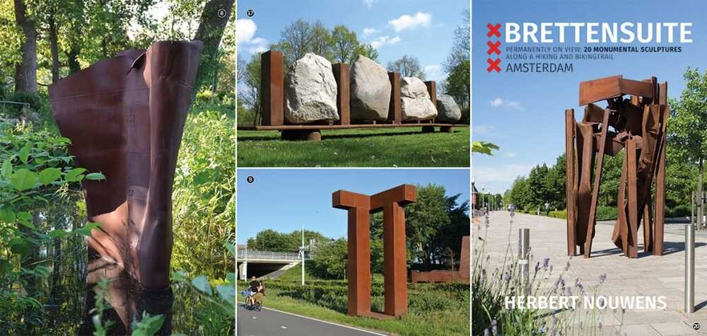 “The relationship between a sculpture and its surroundings is of key importance to me. I therefore deliberately chose places along the bike and hiking trail ‘Brettenpad’ requiring a landmark. This 7km long path starts in Westerpark, in central Amsterdam, and runs past Sloterdijk trainstation to a rural environment at the outskirts of the city. I positioned the sculptures in relation to one another, inspired by musical suites, which are collections of short musical pieces by 17thcentury composers like Bach, forming a series of dances” –