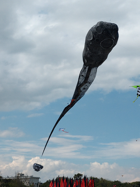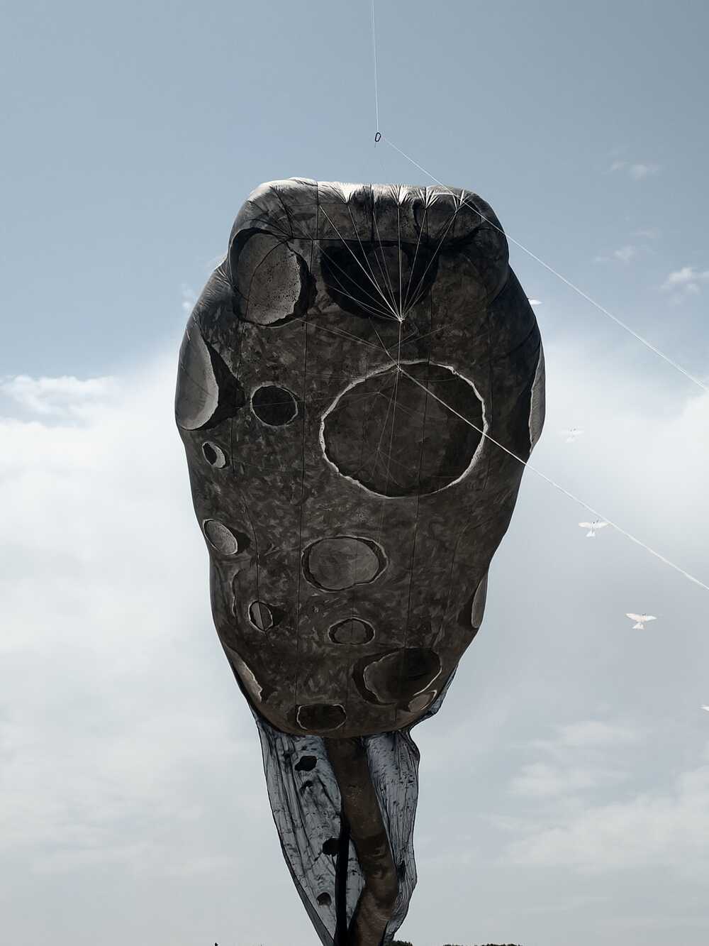 Stabloser, 3-dimensionaler Drachen aus Spinnakertuch, Organza und Schnur. Malerei auf Spinnakertuch.