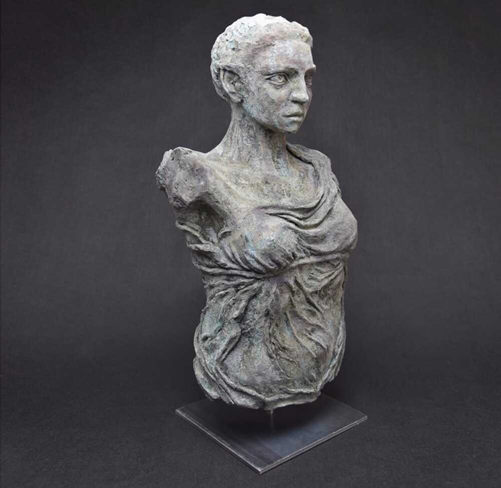 Meine „Nike“ ist angelehnt an die gleichnamige hellenistische Skulptur aus Samothrake entstanden. Ihre Haltung, das Gewand erinnern an diese. Und dennoch fehlen Teile des Körpers: die Beine, die ohnehin fehlenden Arme und - sofort auffallend - die Flügel. Sie ist außerdem bei weitem kleiner, ihr fehlt die Monumentalität, die der „Nike von Samothrake“ mit über drei Metern Höhe eigen ist. Anders als ihr Vorbild kann die Siegesgöttin allerdings ein Gesicht vorweisen. Sie mag nun also ihre Flügel verloren haben, dafür aber schaut sie mit Entschlossenheit und bestimmtem Blick nach vorn.