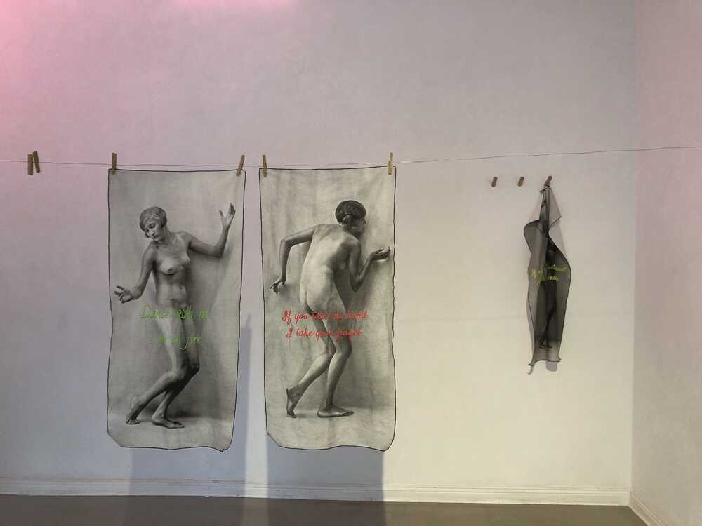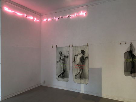 Installation mit Küchenhandtüchern und Neonleuchtschrift