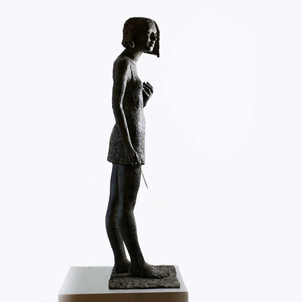 Mittels des Lastens des Körpers visualisiert Susanne Kraißer die Bindungen und Zwänge des Subjekts, während der nach innen gerichtete Blick sowie die auf der Brust liegende Hand die Reflexion dieser veranschaulichen. Die Feder in der Hand der jungen Frau verweist auf die Möglichkeit der Expansion: der schwebende Flug des Milans, frei und ungebunden, liegt in der eigenen Hand. Die Figur spielt „mit den Größenverhältnissen“: „ein Mensch“, so Susanne Kraißer, „könnte nicht mit einer Feder fliegen. Aber allein eine Feder bewirkt eine aufrechte Haltung, ein sich bewusst machen.“