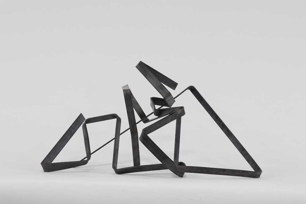 Two bent steel rods, connected into each other, entangled, give the work a new shape, interior forms emerge. By changing and moving the rods, the sculpture changes, becomes a game. To the space game, playful to creativity.