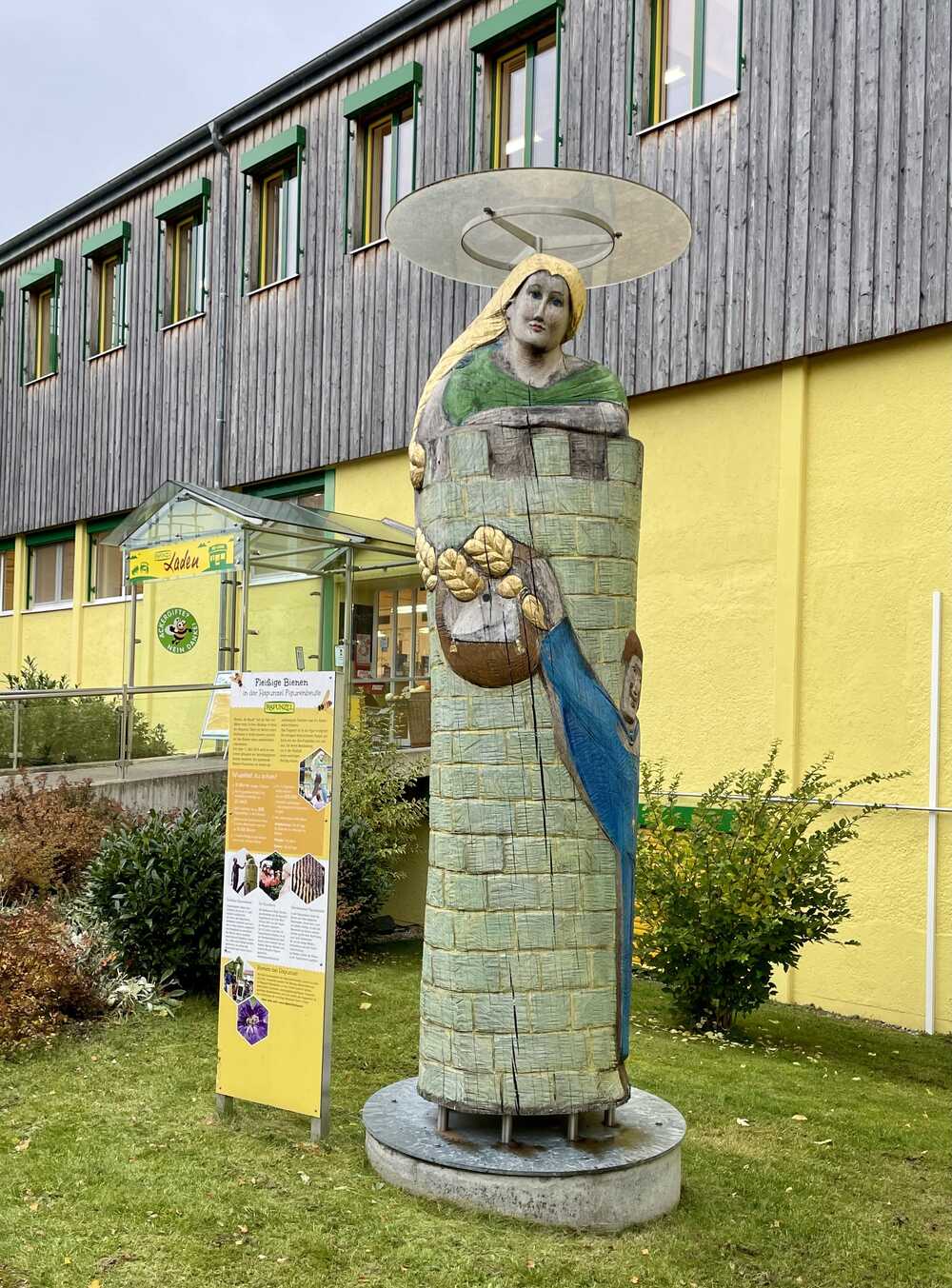 Die Firma Naturkost RAPUNZEL hat einen Bio-Laden im Hauptwerk in Legau/Allgäu. Die Bienengruppe der Firma ist aktiv. Mitarbeiter der Firma betreuen mehrere Völker von Honigbienen auf dem Gelände. Darunter auch in dem Figurenstock Rapunzel. Der Prinz reicht ihr, die ihr güldenes Haar vom Turm herunter läßt einen Korb voller Köstlichkeiten. Rapunzel Zelt zieht diesen mit ihrem langen Zopf zu sich in den Turm. Im Korb befinden sich die Fluglöcher des Bienenhauses.