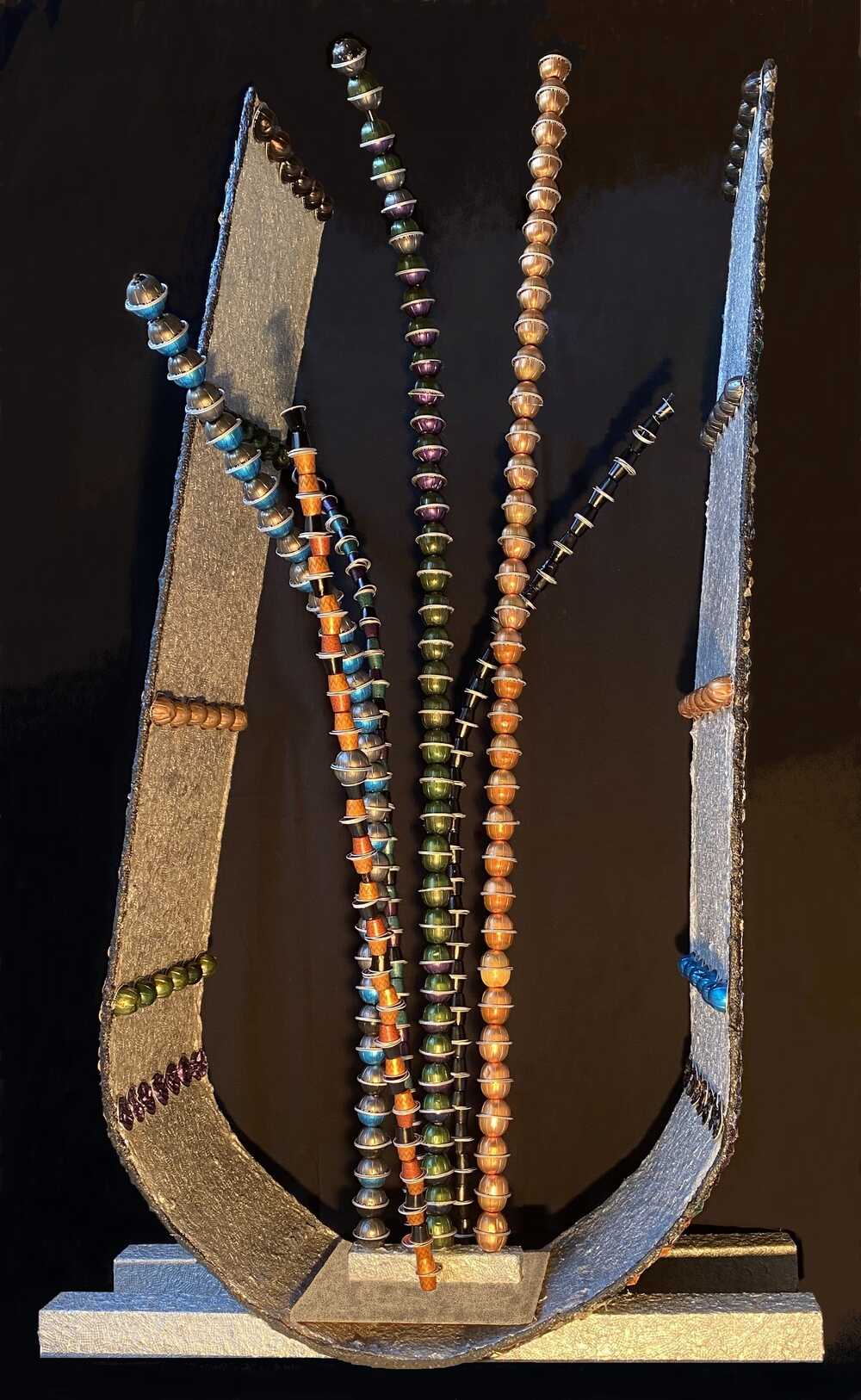 The base material are used aluminium coffee capsules given to me. After cleaning, I cut them into 4 parts, all of which I integrate into the artwork. One outside of the "U-shape" is designed with red-orange-yellow-brown tones, the other with green-blue-purple-black colours. The interior is designed with the silver base parts of the capsules, large capsules from industrial coffee machines form the countdown lines, so to speak, when firing the 5 capsule arrows of different lengths and curves from the centre of the "U" into the universe.