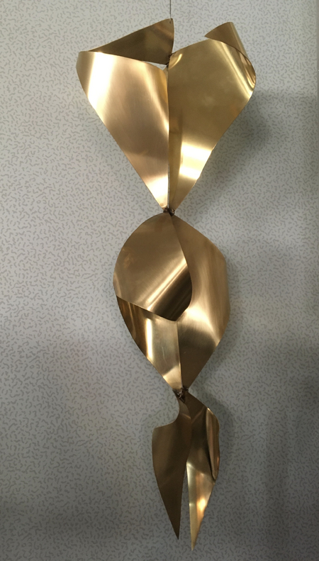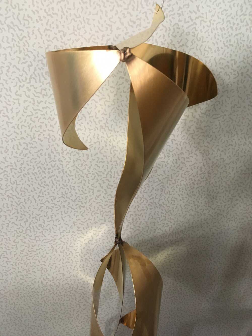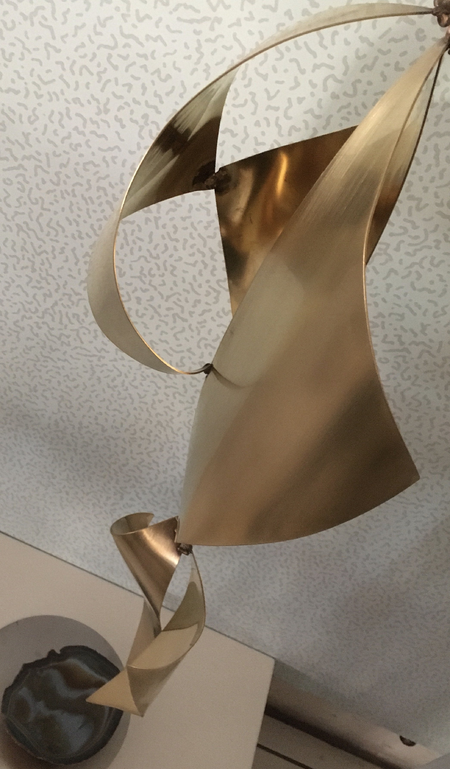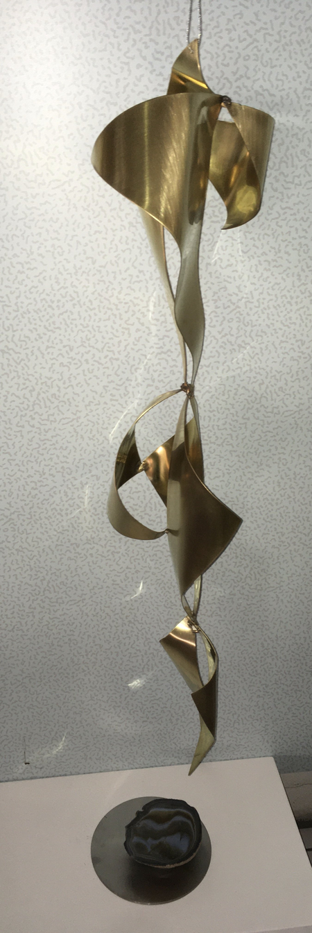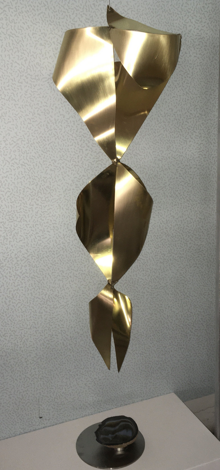 Der abstrakte Frauenkörper ist aus Messingblech gemacht, und schwebt über der Erde (Achat).