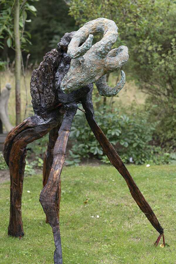 Tierfigur aus Holz, Eisen, Ton, farbig gefasst