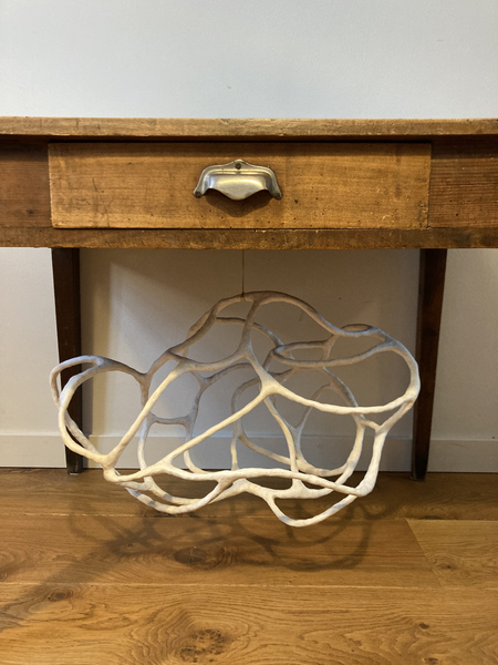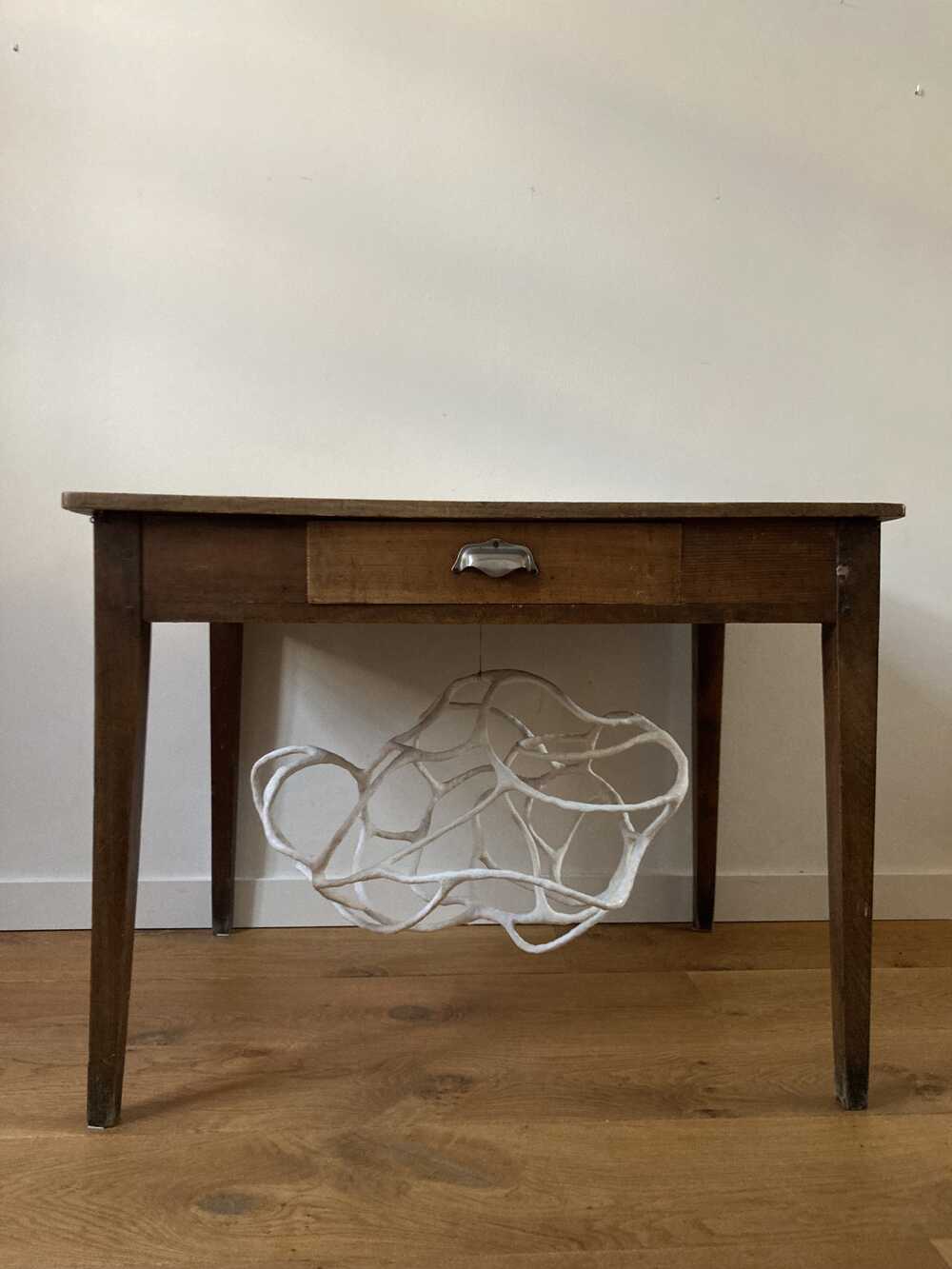 Een ademwolk onder tafel. Een beeld ontstaan vanuit mijn dromen. De hangende ademwolk heeft een aluminium frame en is verder vervaardigd uit papierpulp.