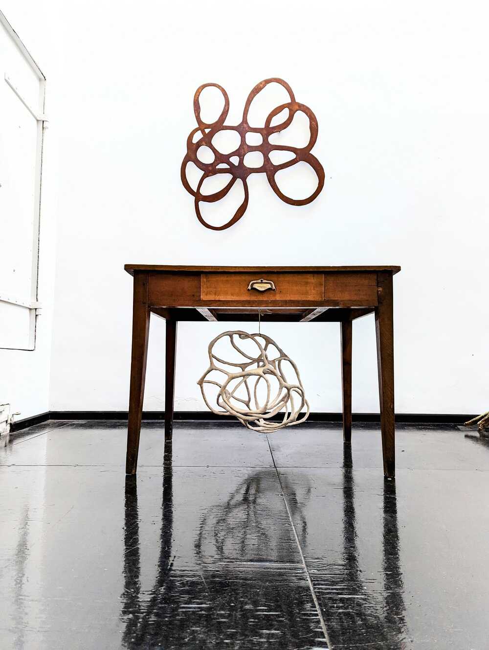 Op deze foto ziet u de beelden Droomdimensie I en Under Table gefotografeerd tijdens de expositie Nachtboek