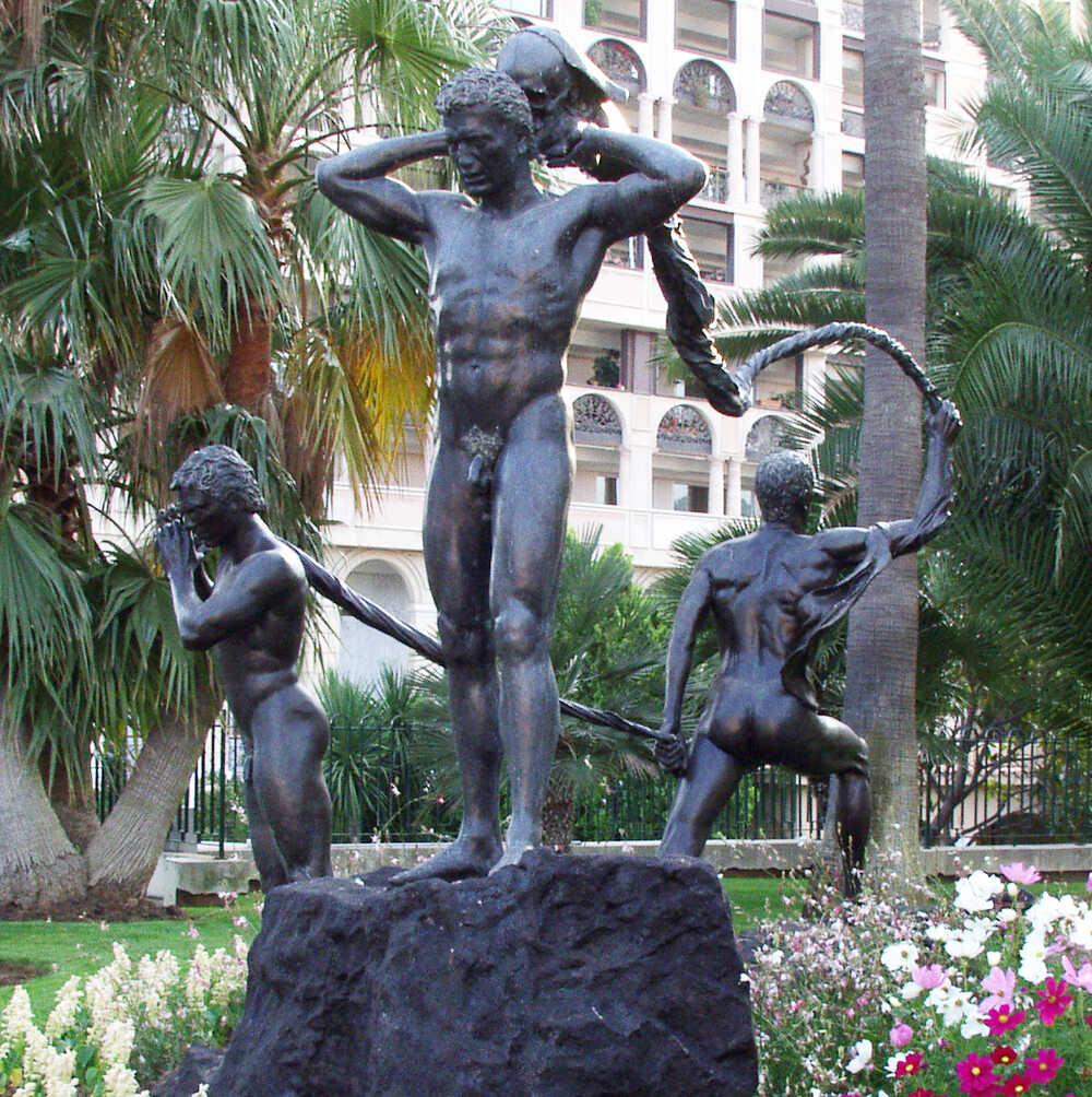 In his studio in Fontvieille, Blake Ward has worked for three years creating these figures of beauty. The young artist considers the realization of this imposing group of statues celebrating life, an accomplishment towards fulfilling the role of a sculptor. " Les Atlantes " portray three men carrying their history behind them, symbolized by a skull and a shroud containing the secrets of their past, representing the burden they carry and the outcome of each man’s life.