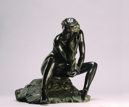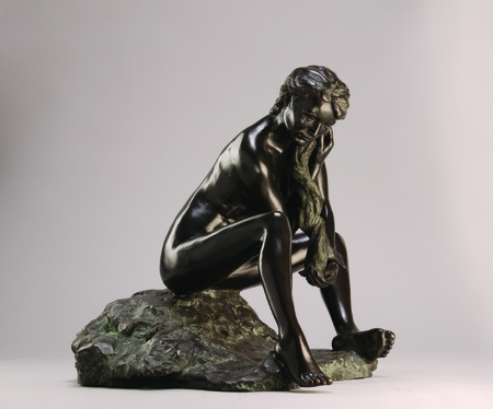 From the back the figure is seen with a beautifully curving spine that compliments the slope of the shoulders and the opposing contra-posto position of the hips. Viewed from the front the lack of modesty in her seated position introduces a vulnerability that embellishes her fragile introspective nature.