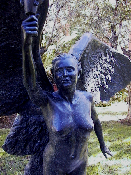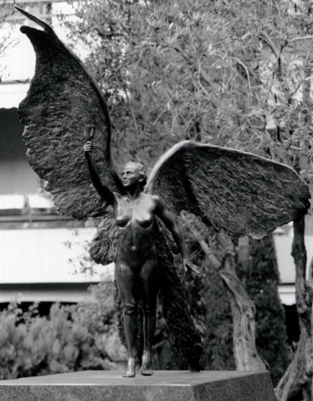 The angle-like “Messenger” is representative of the spirit, portrayed as striding forward as she gently lands, and begins to furl her dramatic wings. Demonstrating a continuing interest in mythological history, this heroic figure represents the bearer of wisdom and enlightenment, much as flight has an affinity with both science and spirit. The movement of her arms confirm her attachment with the heavens as well as the earth with her right arm reaching to the sky and her own spirituality, as her left searches for the earth and its humanity.