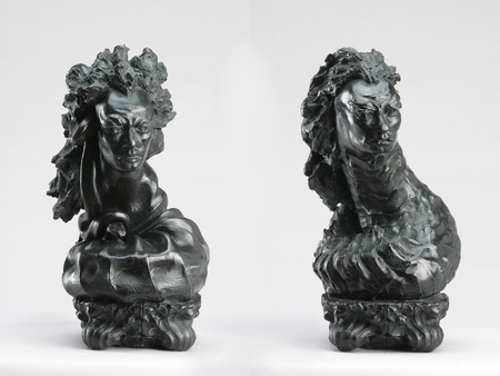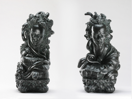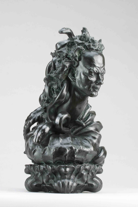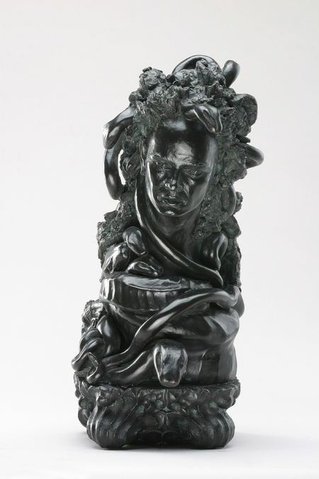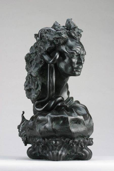 The sculptural work depicts the metamorphosis of Medusa in four stages as she turned from woman to monster. Beginning with a conventional image of a handsome woman, whose hair is adorned with snakes, as described in the early myths. The serpents around her gradually become less abundant as she absorbs them into her changing persona.