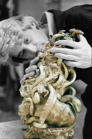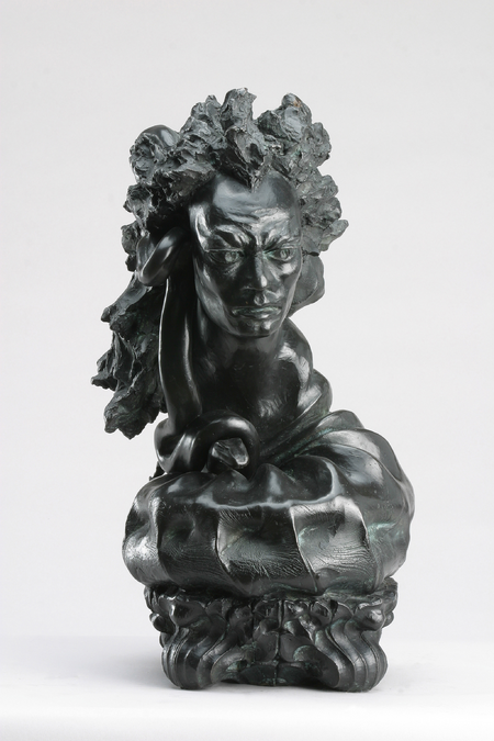 The inspiration for this work was found in the archaeological study of Greek and Roman temples, often decorated with the heads of the Gorgons. These portraits in high relief adorned he keystones that crowned many of the arched doorways and portals and were placed upon grave markers to avert the forces of evil and to protect those within from harmful and mischievous spirits. With the rise of the Christianity, these pagan traditions were refuted and the portraits were presented as decorative motifs.
