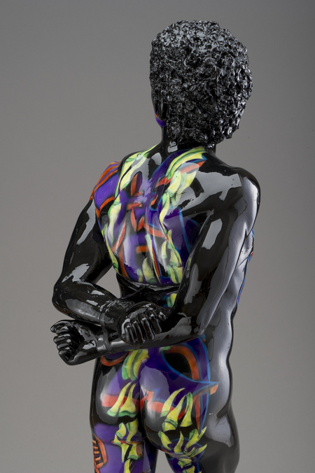The rebellious energy is apparent in the pose chosen for the Captive, as he turns towards an intolerant society. With his hands restrained behind his back and attached to a strap surrounding his chest denying him the oxygen required for freedom.