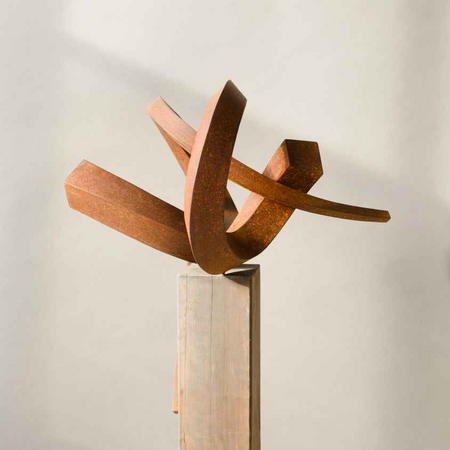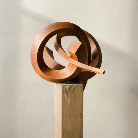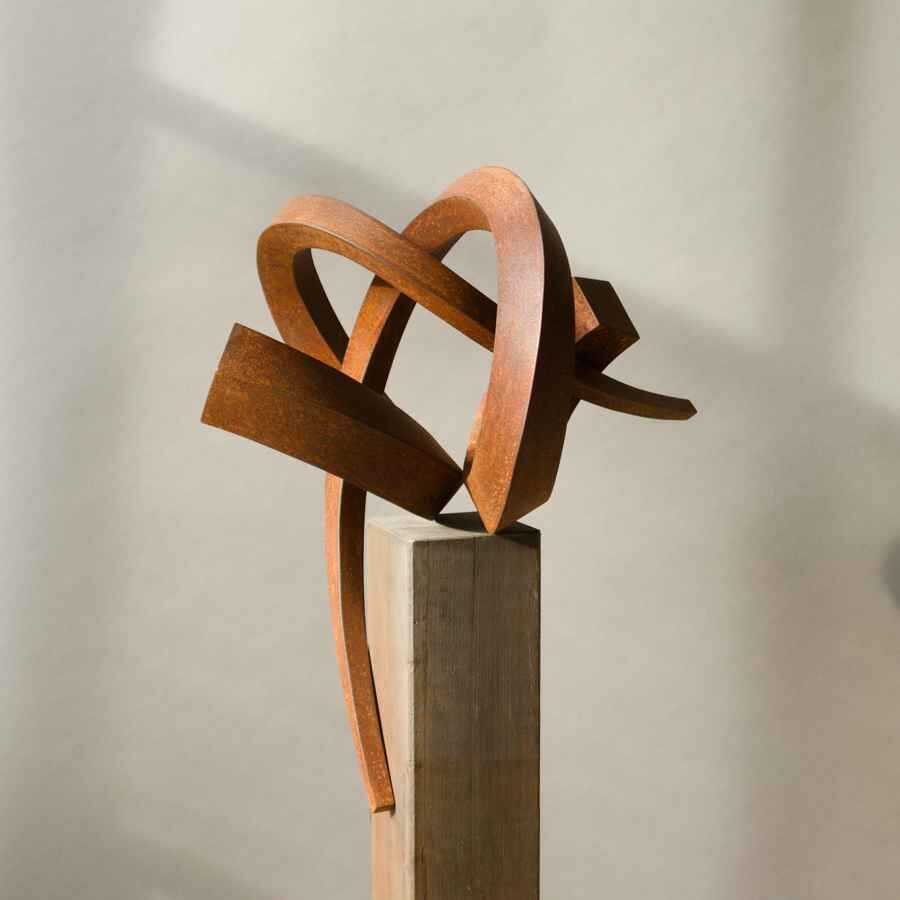 Die keilförmigen, zu beiden Enden sich vergrößernden Querschnitte der ineinander verschlungenen Skulptur treten durch ihre Formgebung in einen Dialog. Sehr edel wirkt die oxidierte Oberfläche der für den Innenbereich geschaffenen Skulptur.