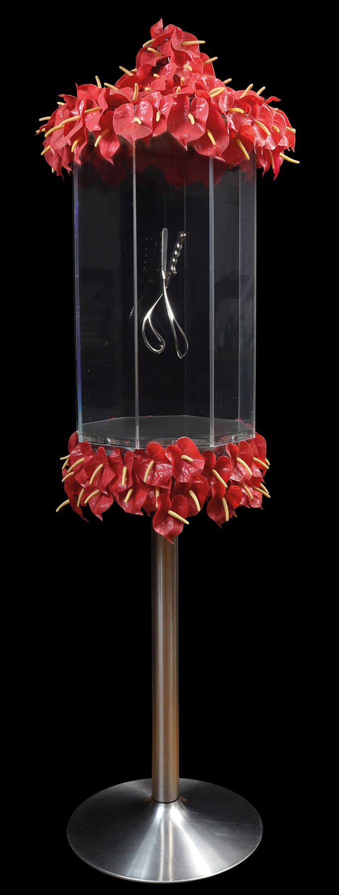 Ober- und unterhalb ist der prismaförmige Schaukasten mit Kunstblumen, roten Anthurien, bestückt. Rot ist die Farbe des Blutes und des Körpers und gilt als kraftvoll und energiegeladen, in manchen Religionen auch für die Erschaffung der Menschheit.