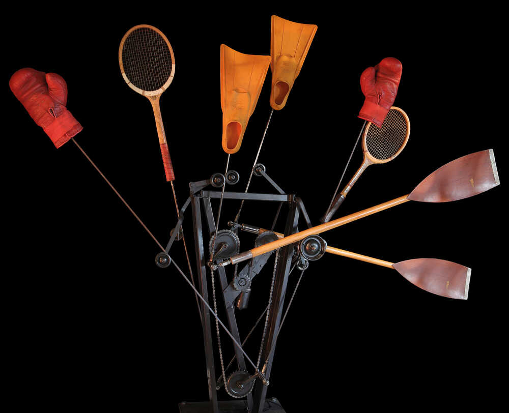 Schwimmflossen, Boxhandschuhe, Tennisschläger und Holzpaddel in warmen Farben – von Beige über Orange und Rot bis Braun – führen einen eigentümlichen Tanz auf. Die Tennisschläger repräsentieren einen typischen Breitensport, Schwimmflossen und Paddel stehen stellvertretend für sportliche Fortbewegung zu Wasser, die Boxhandschuhe verkörpern exemplarisch den Kampfsport. Die jeweils paarweise agierenden markanten Formen erinnern mit ihrem Erscheinungsbild an die Trimm-dich-Bewegung der 1970er-Jahre und deren Kampagne mit dem Slogan „Trimm dich durch Sport“.