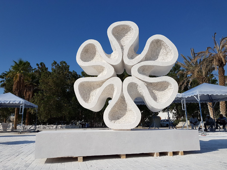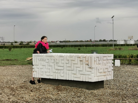 The channels of the excavated labyrinth have a rough / textured surface, as well as the surface of the horizontal base, leaving the natural rupture of marble, capitalizing on the poetic dimension generated by the natural appearance of marble and the adversities of existence and destiny of every human being on the path of spiritual knowledge and realization and, paths that are transposed into Kufic writing and offer a harmonious and poetic perception, related to the beauty and mystery of existence. This aspect generates a visual and symbolic contrast with the outer surface of the cubes, which is smooth (but not polished). The labyrinthine paths are a metaphor of human destiny, the fact that we have to discover the path to fulfillment, through good actions and contemplation of the high values of existence, in all the aspects in which they manifest. On the horizontal pedestal, next to the large cube, is inserted a small glossy black disc (in visual contrast with the pedestal with the structure of the broken marble), which symbolizes the beginning of the universe, the primordial Word.