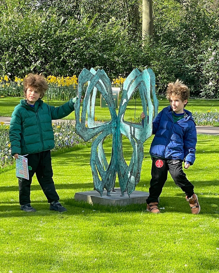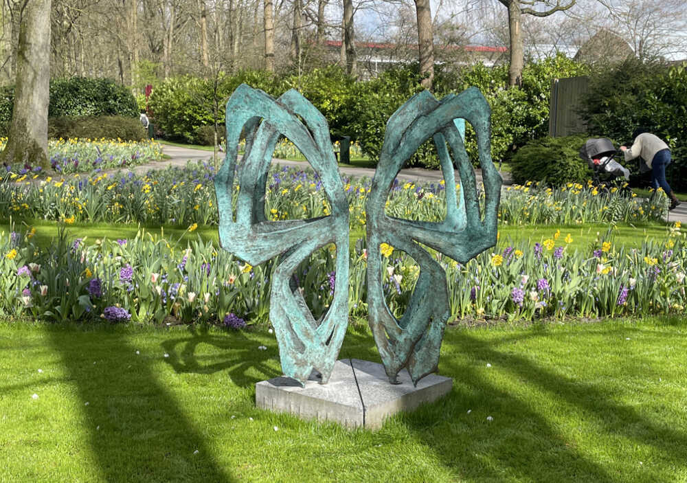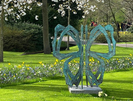 Butterfly Kiss (2023) is an installation with the measurements of 120x120x70 cm ,(47in x 47in x 27in) consisting of two mirror-image symmetrical objects. The sculptural forms create the illusion of fluttering wings and a visual play of two individual butterflies transforming into one. The sculpture symbolizes that “We Are All One”.