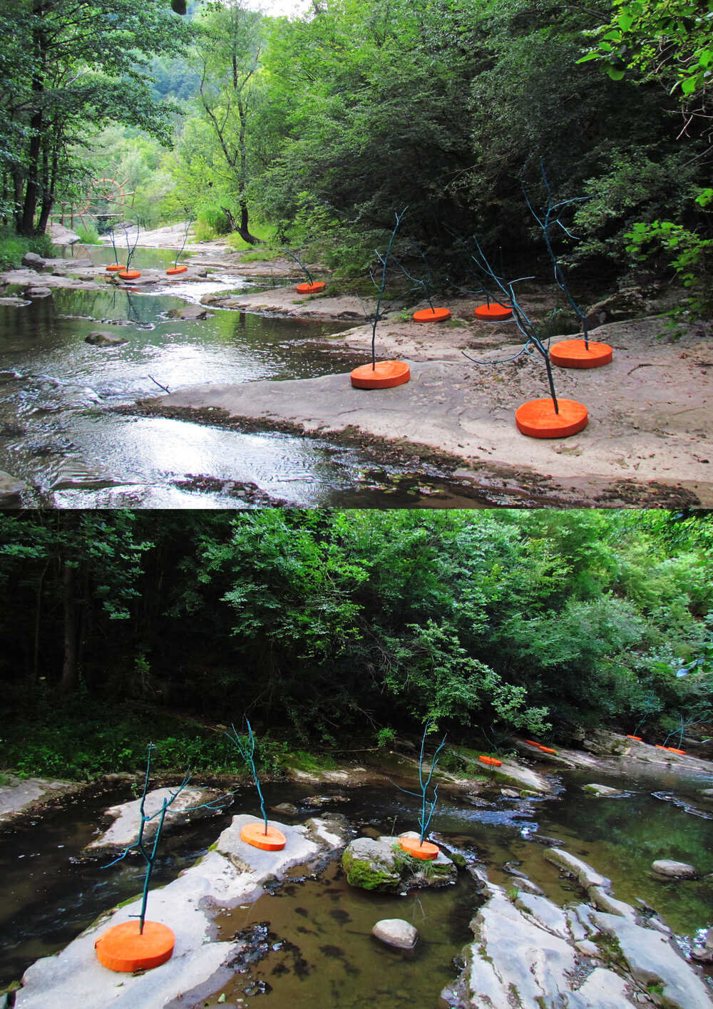 Nine little islands, made of painted (water-based paint) wood slices, and branches for a creek in the valley of Gabrovtsi un line with the symposium ART-NATURE.