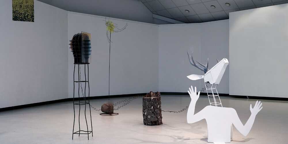 The installation Nature / Civilization II reflects on the relationship between nature and technology. Digital, virtual reality is an illusory reality of pixels on a screen, created by artificial intelligence that performs many functions for us. On one side, the reality that we experience directly, with all its textures, materiality or spatiality; on the other, the digital reality on the screen, which can be "corrected" and loses its tangible, haptic aspect. Another motif of this installation is the different worlds of man and animal fighting for space. At the centre of the installation is a fragment of a natural birch tree trunk, to which three different objects are connected by umbilical cords (or from which they seem to grow), revealing different aspects of the interface between nature and technology.. |