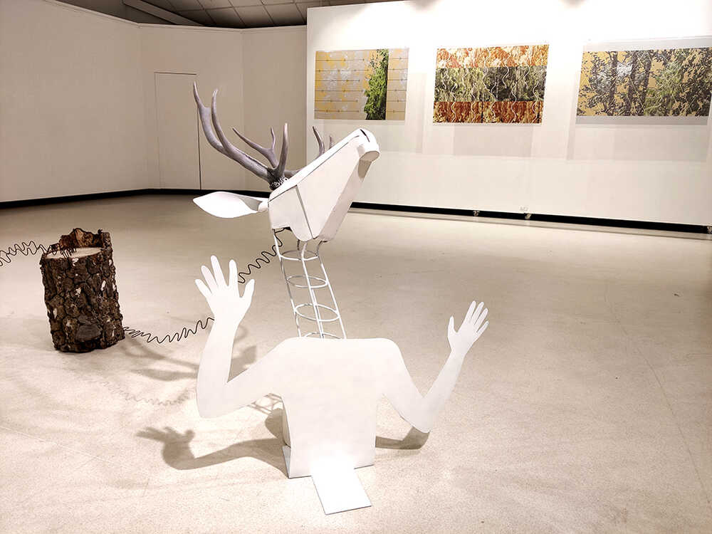 The second object of the installation, Synchronous Movement. Encounter, is an allusion to the different living spaces of man and animal. It was born out of a real experience, the author's encounter with a wild deer in a dense forest. The startled animal's leap aside triggered a reflection on the different spaces – those of animals and us – whose relationship changes to their disadvantage. |