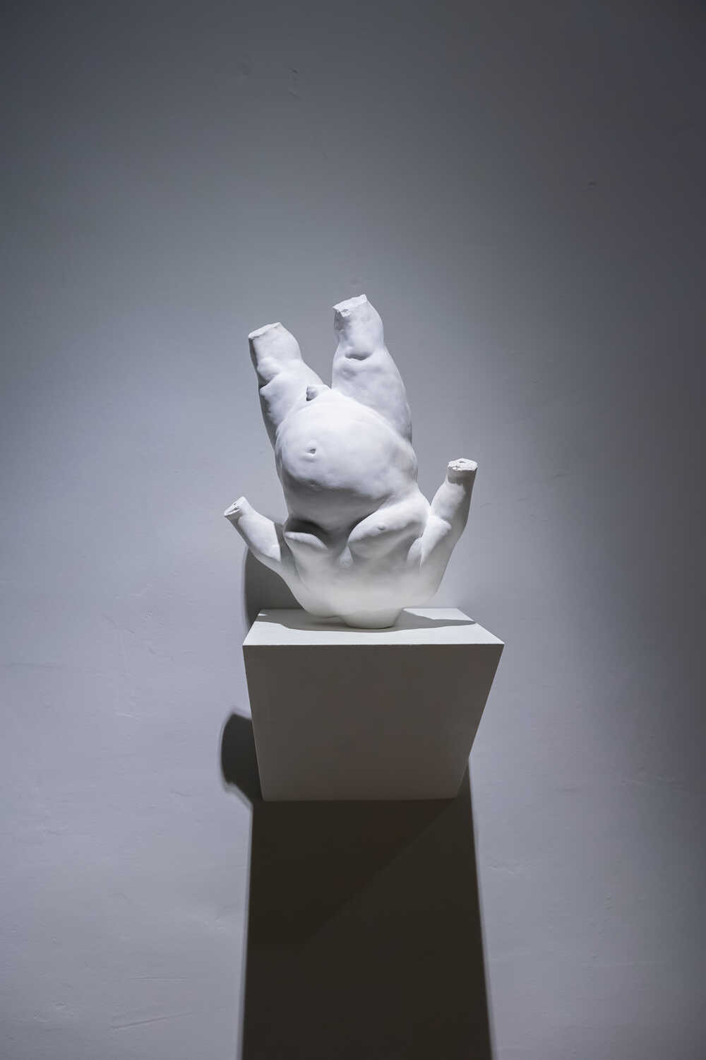 The predominantly monochromatic white sculptures show, in essence, an expressive simplicity, they nonetheless bear an extraordinary air of significance. The works achieved their current form through the artist’s development from more colourful, epic scenes through the harmonizing of traditional sculptural motifs to their present “OFF white” format of material and thematic reductions. The character of the works can evoke the sensation of almost overwhelming frankness, but this allows us to pinpoint them with a degree of certainty and subsequently auto-interpret their multiple layering within a psychological framework based on lived experience. The viewer becomes an observer of human destiny, perhaps helping them to understand their own fates.