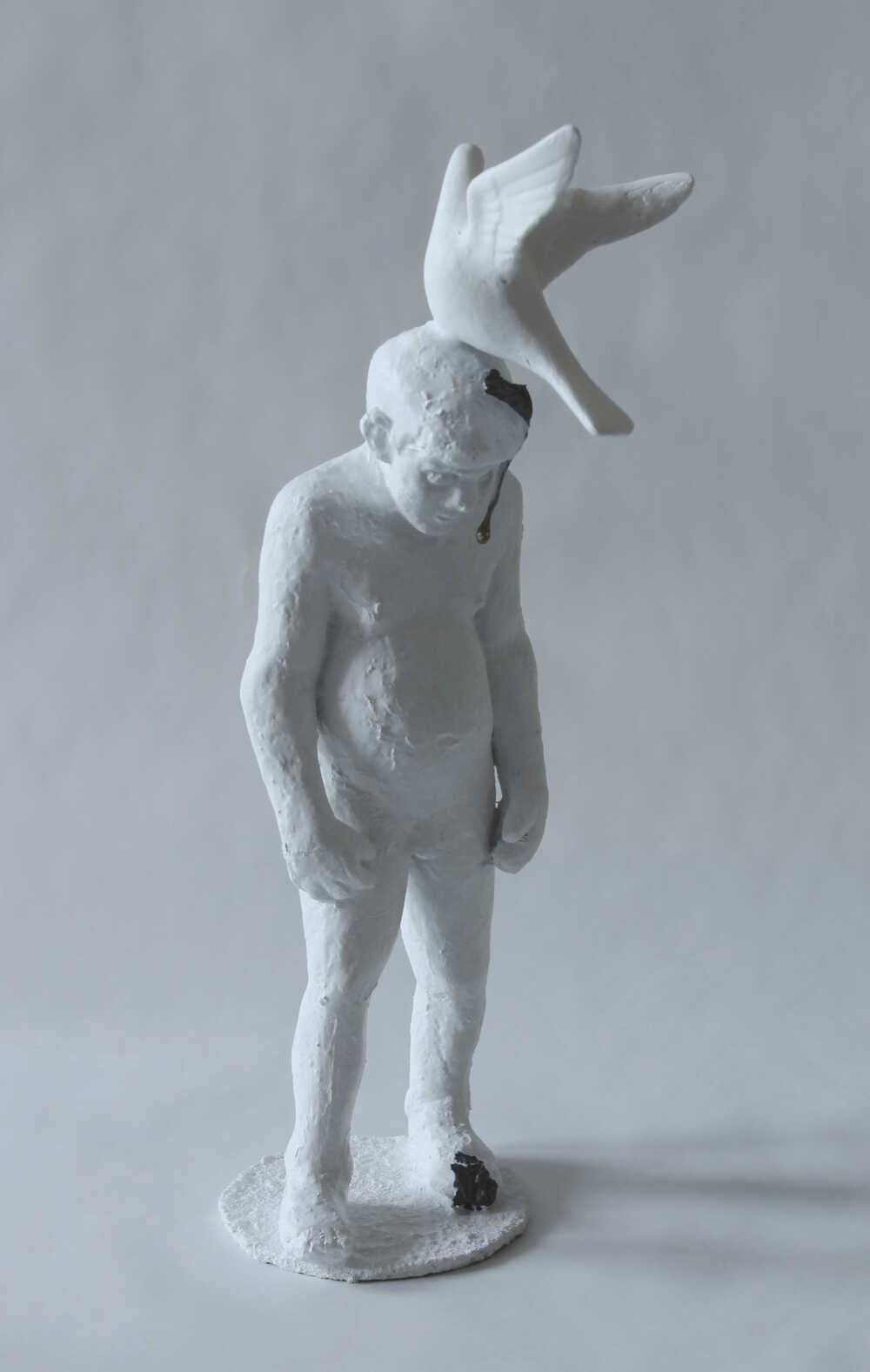 The predominantly monochromatic white sculptures show, in essence, an expressive simplicity, they nonetheless bear an extraordinary air of significance. The works achieved their current form through the artist’s development from more colourful, epic scenes through the harmonizing of traditional sculptural motifs to their present “OFF white” format of material and thematic reductions. The character of the works can evoke the sensation of almost overwhelming frankness, but this allows us to pinpoint them with a degree of certainty and subsequently auto-interpret their multiple layering within a psychological framework based on lived experience. The viewer becomes an observer of human destiny, perhaps helping them to understand their own fates.