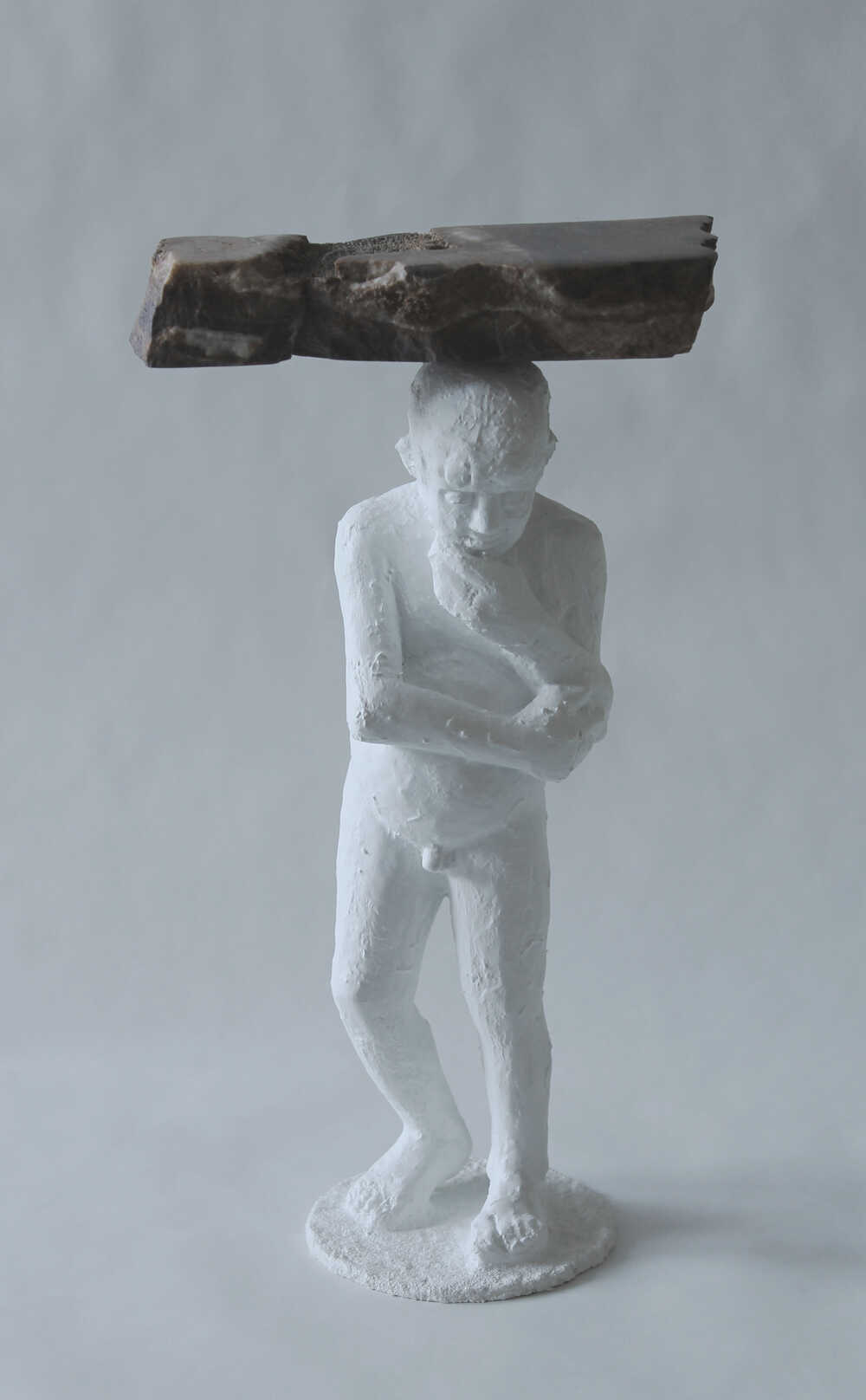 The predominantly monochromatic white sculptures show, in essence, an expressive simplicity, they nonetheless bear an extraordinary air of significance. The works achieved their current form through the artist’s development from more colourful, epic scenes through the harmonizing of traditional sculptural motifs to their present “OFF white” format of material and thematic reductions. The character of the works can evoke the sensation of almost overwhelming frankness, but this allows us to pinpoint them with a degree of certainty and subsequently auto-interpret their multiple layering within a psychological framework based on lived experience. The viewer becomes an observer of human destiny, perhaps helping them to understand their own fates.