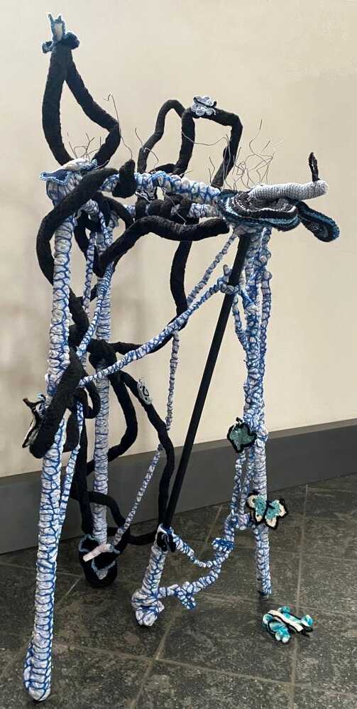 Three metal legs are covered with crocheted fabric, over which a blue wool thread is roughly crocheted. Individual bands of the same material hang irregularly between the legs. The fourth metal leg is uncovered and stands askew, the upper corner bent off. A tube of fabric, meant to be a snake, snakes up menacingly in the dark. Three loops are reminiscent of a possible backrest. Pointed wires rise from the remaining edge of the seat. Intended as a further obstacle to being able to use this throne. But here, too, there are a few butterflies in matching colours, as a sign of hope that mesnchheit may yet succeed in banishing this danger.
