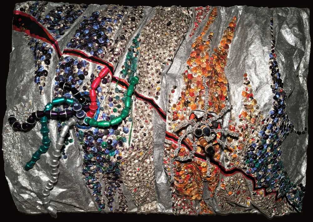 A stiffened fabric laid in folds shows completely encapsulated "chains of hills" and valleys crossed diagonally by a red tear