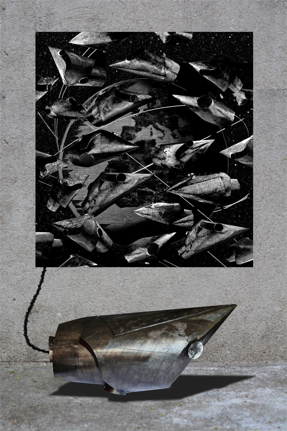 "An Object with a map“ is a possible model of such a spacecraft. Spacecraft images are also adapted for digital artwork. The worldmap on the spaceship is twisted so that the different continents are connected as a hint of a common effort to survive.
