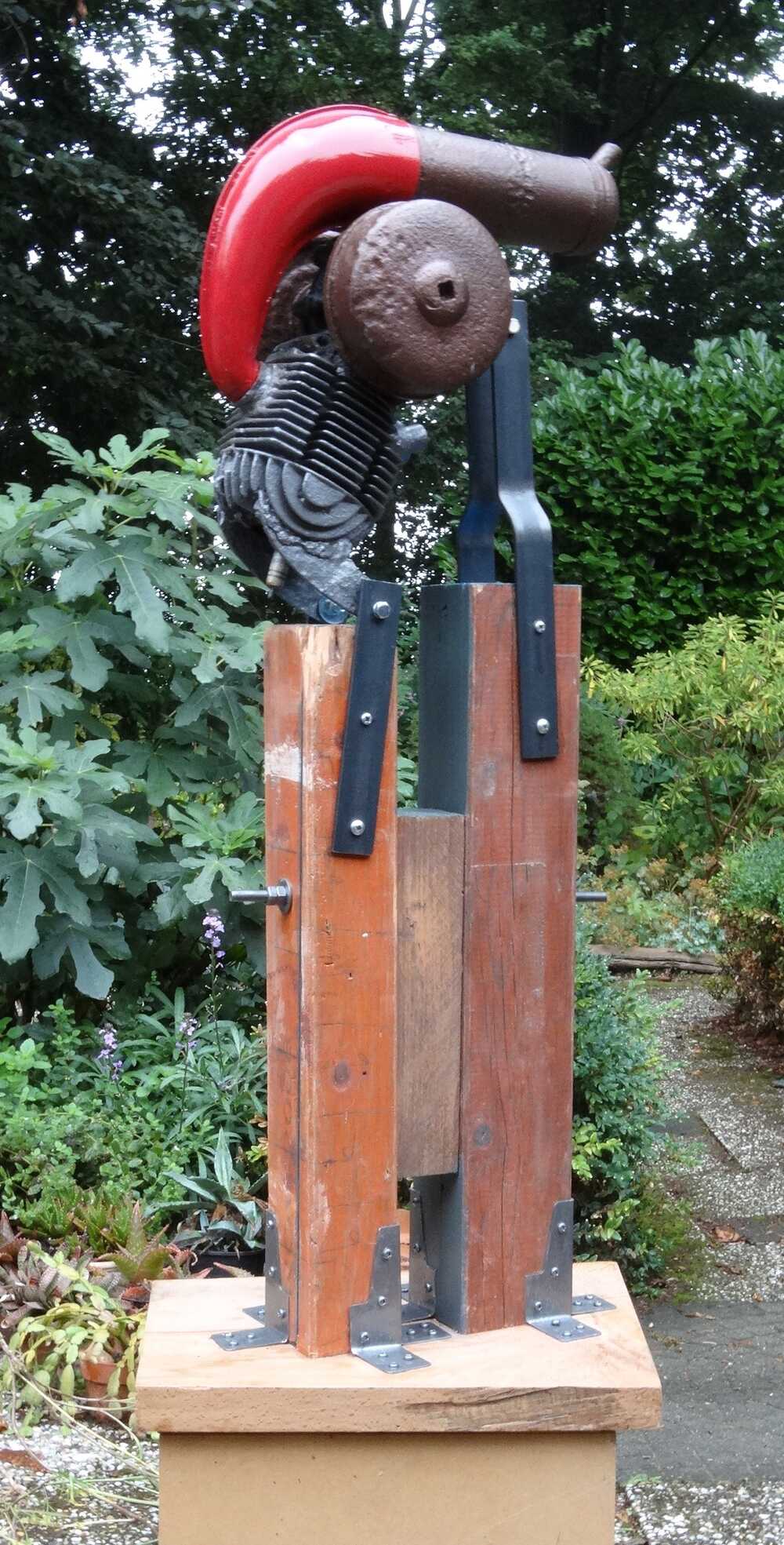 An engine of historic Kaptein Mobylette 50 cc motocycle was found, restored and mounted on wood