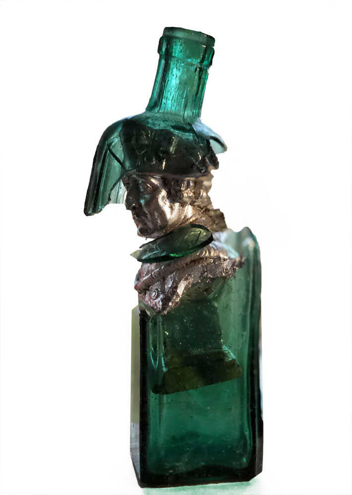 Assemblage einer Gipsbüste des Friedrichs des GRoßen und einer antiken Glasflasche